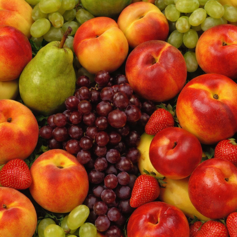 Probablemente: duraznos, pelones, uvas, peras, frutillas. Las variedades pueden cambiar según disponibilidad